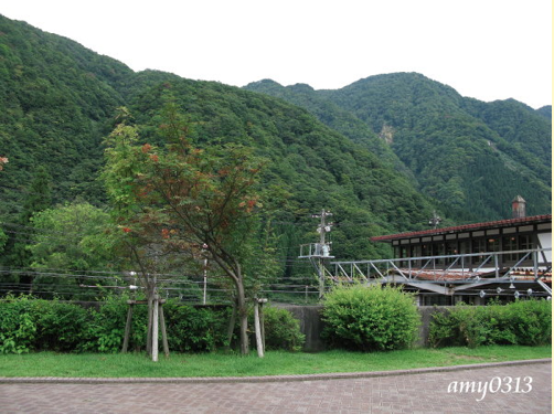搭乘電動巴士穿越立山主峰來到了大觀峰,接下來要搭乘的就是最期待的“空中纜車”。 一下車就看到遠遠的空中纜車行駛在V字形的山谷中。 小小車站裡…